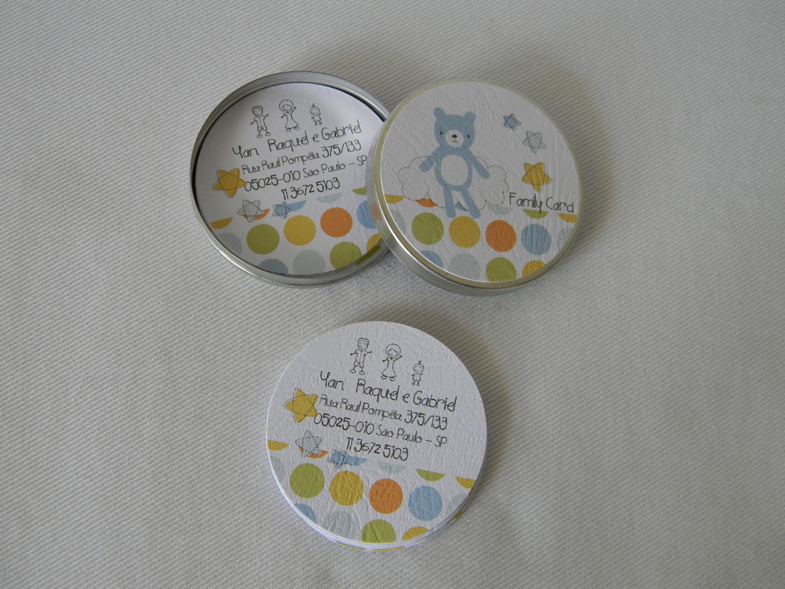 Uma outra versão do Family Card é o Mommy Card – cartão na latinha com os dados da mamãe e o nome do filhote!! Este é pra quem tem filhos crescidinhos, ideal para contato com as mães dos coleguinhas da escola ou de outras atividades do seu filho!! E ainda vem na Latinha!! Ótimo para deixar na bolsa!!!!