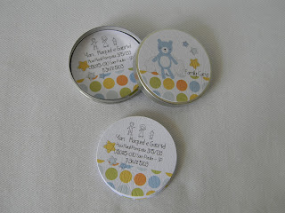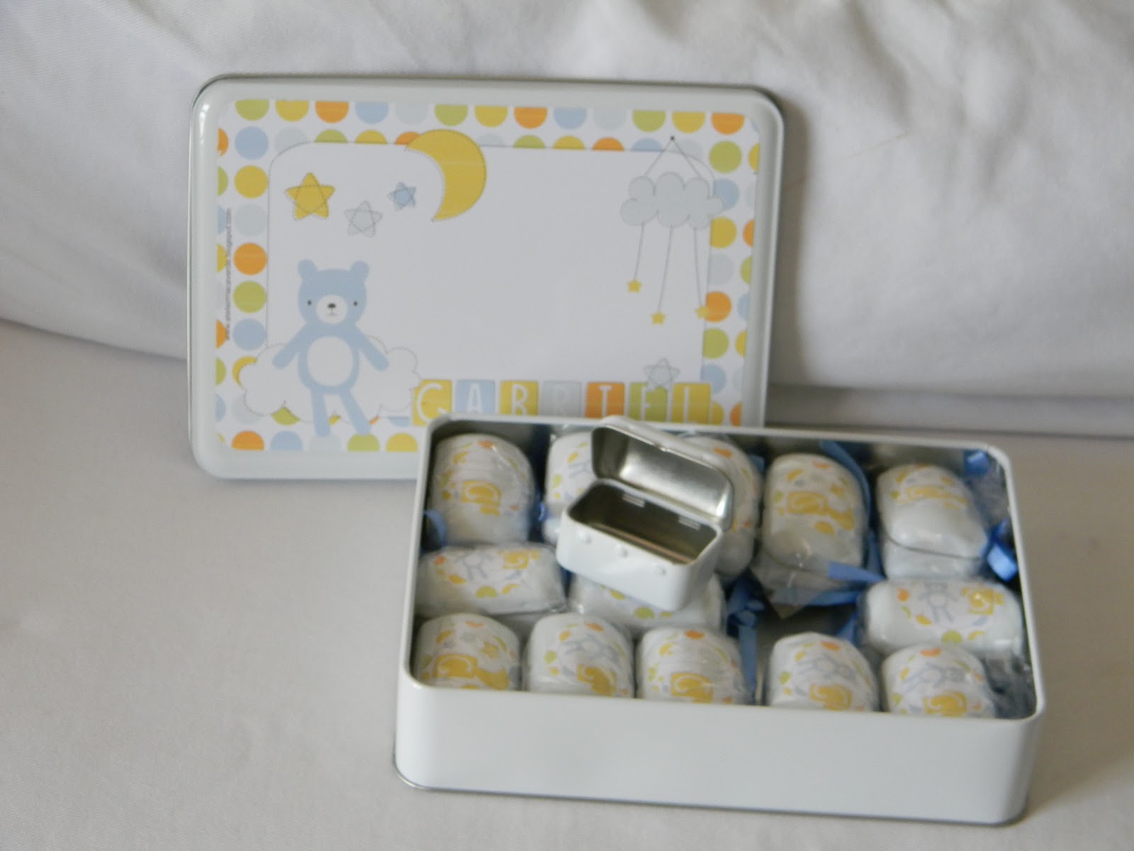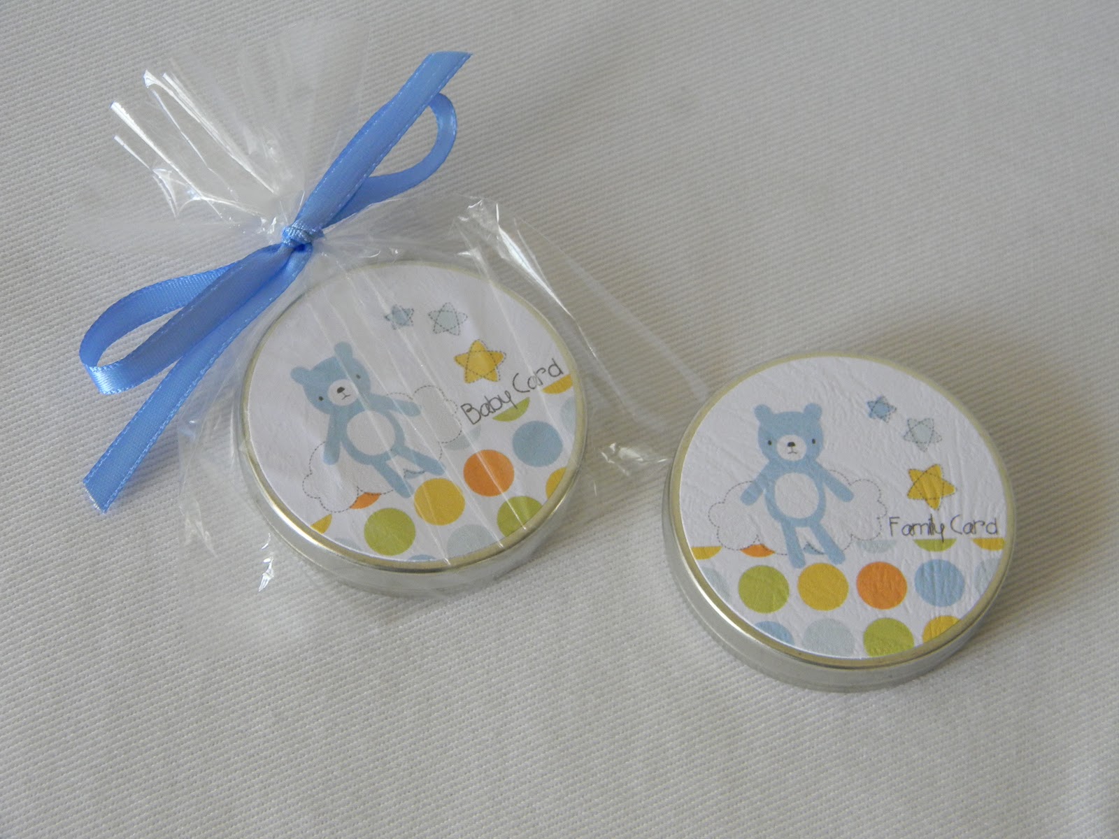 Baby Card – Cartões na latinha com os dados do bebe: data e hora do nascimento, peso, altura, signo… Muito legal para ser distribuído na maternidade!! Percebam q este foi personalizado no mesmo tema da lembrancinha do post anterior!!